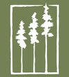 A circular black and white logo with a stylized pine tree, mountains, and a branch, surrounded by a circle outline.